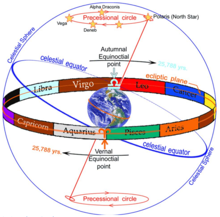 Dar apropierea sau departarea de Soare nu are nimic de-a face cu succesiunea anotimpurilor, care sunt date de inclinatia axei de rotatie a Pamantului si nu de distanta sa fata de Soare. Aceasta axa este o linie imaginara care trece prin centrul planetei si polii acesteia si are un unghi de inclinatie de 23,5 grade in raport cu ecliptica – planul in care se roteste in jurul Soarelui. Orientarea acestei axe acum este catre steaua fixa Polaris din constelatia Ursa Mica, indicand directia spre Nordul geografic. Aceasta orientare a axei nu este fixa si nu a fost dintotdeauna orientata catre steaua Polara. Pamantul nu are forma unei sfere perfecte, el este turtit la poli si bombat la Ecuator si se roteste in jurul axei sale precum un titirez, iar axa sa isi schimba directia gradual, formand un cerc in forma de con pe care-l parcurge in aproximativ 26.000 de ani. Aceasta se numeste miscare de precesie avand drept consecinta precesia echinoctiilor, adica o deplasare retrograda a punctelor echinoctiale de-a lungul eclipticii. Datorita acestui fapt, in perioada Egiptului antic, axa Pamantului era inclinata catre steaua fixa Thuban din constelatia Dragonul, iar in jurul anului 14.000 steaua fixa Vega din constelatia Lira va indica Polul Nord.