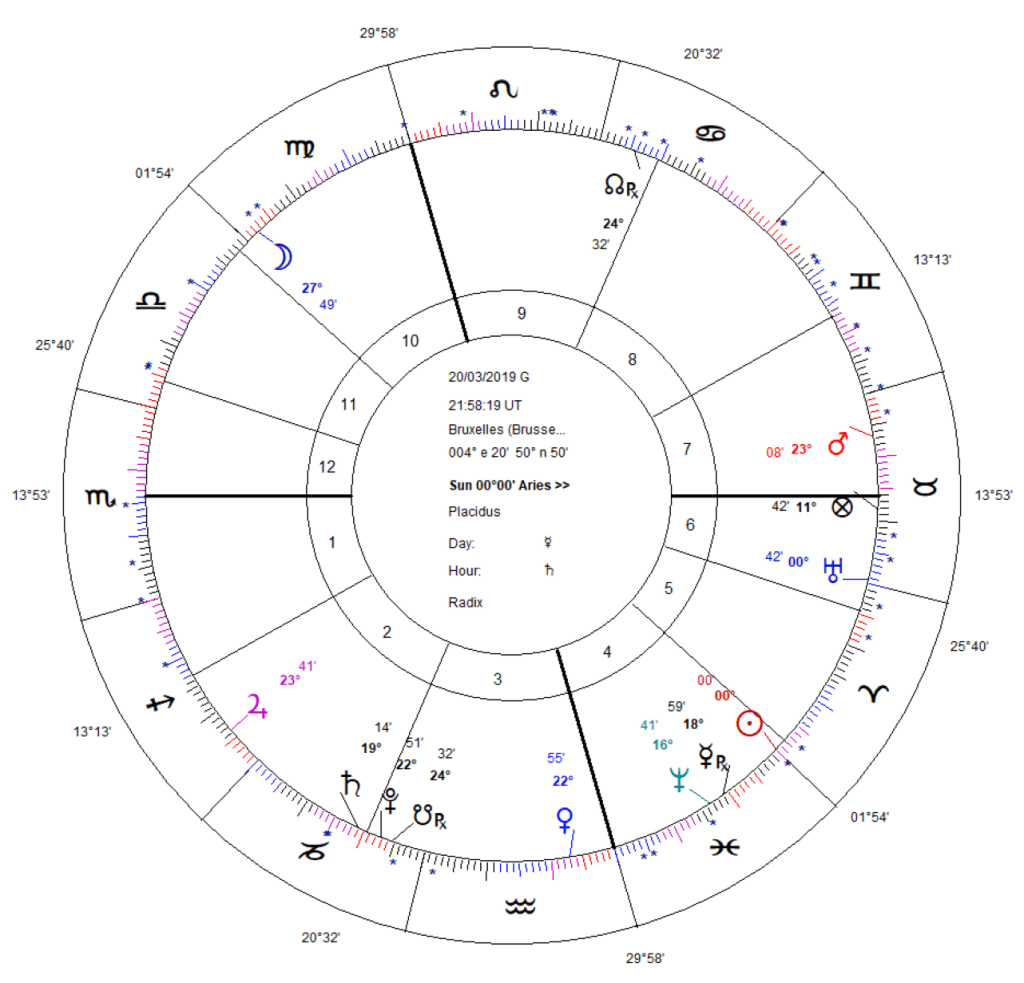 Ciclul planetar Jupiter – Saturn 2000 – 2020 din Taur nu a fost unul din cel mai fericit pentru Uniunea Europeană, cu câteva excepții. Taurul este un semn fix, stabil, de pământ, de construcție și consolidare și acesta a condus la consolidarea UE prin aderarea de noi state printre care și România. Dar Conjuncția Jupiter/Saturn s-a format pe cuspida casei VIII la gradul 23 pe steaua fixă Algol, capul Gorgonei tăiat de Perseus, o stea asociată cu criză, distrugere și moarte. Criză financiară începută în anul 2008 este primul efect al acestei Conjuncții deoarece casa a VIII-a este și o casă financiară, a banilor altora și această criză a fost una a datoriilor țărilor europene. Mai mult, Conjuncția Jupiter – Saturn se află la MC (antiscia) situată pe nebuloasă Praesepe considerată o a doua Algol, care ne vorbește despre criză și boală, în opoziție cu Neptun angular la FC, indicele unei boli contagioase ce afectează întreg teritoriul UE. Marte, stăpân de casă II al finanțelor este afectat prin poziția să în casă VIII-a fiind sub razele Soarelui și ca tabloul să fie întregit, Luna, semnificatoarea populației o aspecta pe Venus, stăpână de casă VIII, o casă ce ne indică rată de deces a populației. Așadar, exista un potențial uriaș de pierdere în masă de vieți omenești prin boală, dar acest potențial trebuia activat de o altă configurație universală.