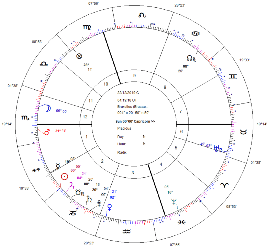 Harta solstițiului de iarnă din 22 decembrie 2019 indică activarea acestui potențial prin poziția lui Marte la gradul 21 Scorpion în opoziție cu conjuncția Marte – Algol la gradul 23 Taur din harta echinocțiului de primăvară. Această harta ne indică apariția pandemiei în următoarele 3 luni. Pandemia este declarată în 12 ianuarie 2020 când Saturn forma conjuncția cu Pluto în Capricorn.