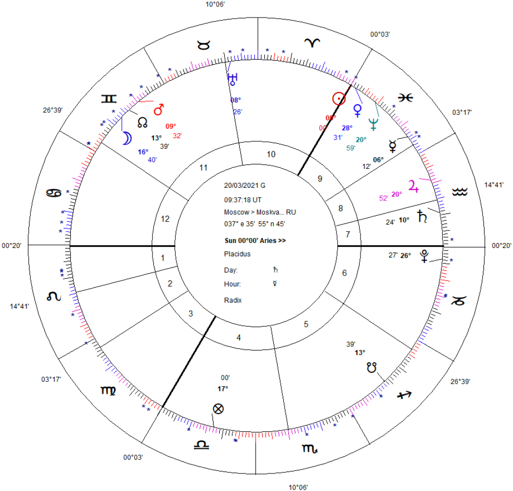 Am scris intr-un alt articol ca in astrologia mundana, gradul Conjunctiei Jupiter – Saturn este extrem de senzitiv la anii in care la echinoctiul de primavara (Ingresul Soarelui in Bertbec), o planeta sau o axa principala (Asc sau MC) se afla la acel grad pentru ca nu face altceva decat sa activeze potentialul Conjunctiei Jupiter-Saturn. Daca privim harta echinoctiului din primavara din 2021 pentru Moscova, Asc se afla la 0 grade Leu, iar Dsc la 0 grade Varsator. Marea Conjunctie Jupiter – Saturn din decembrie 2020 a avut loc la gradul 0 Varsator, ceea ce corespunde cu gradul Descendentului din harta de ingres de la Moscova. Cum conjunctiile Jupiter – Saturn sunt surse de razboaie (Ramesey) si Descendentul este inceputul casei VII (o casa a razboiului printre altele), era evident ca Rusia va incepe un razboi in anul astrologic 2021-2022.