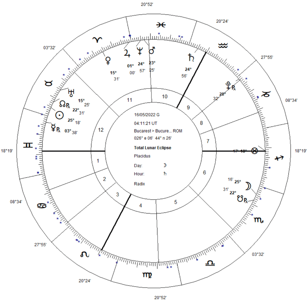 In contextul scaderii dramatice a puterii de cumparare a leului, merita sa privim harta de ingress de primavara si cea a eclipsei totale de Luna din 16 mai. In tema de ingress, prezenta Lunii in casa a II-a, indica faptul ca atentia populatiei va fi orientata catre aspectul financiar, catre resursele energetice si alimentare a tarii. Luna este atat un factor de schimbare ce produce fluctuatii financiare la bursa, actiuni si pe piata de capital, cat si un factor de instabilitate financiara si economica, ceea ce conduce la o depreciere a monedei nationale. Problema este ca Luna deja se afla in Via Combusta si tocmai schimba semnul in Scorpion, locul ei de cadere, indiciu ca populatia traverseaza o zona arida, dificila economic, dupa care urmeaza caderea. Acest lucru inseamna criza, o depresie sau o recesiune ce va exacerba nemultumirea populatiei. Cum Luna stapaneste si casa a XI-a (bani de la Guvern), acestia sunt insuficienti pentru a avea un impact evident de redresare a economiei (PNRR?). Venus, stapana case II, este slabita prin pozitia sa peregrina in Varsator, fiind asediata de Marte si Saturn si tensionata prin aspect de Uranus. Aceasta inseamna o incetinire brusca a economiei datorita socurilor provenite din strainatate (Uranus in IX).