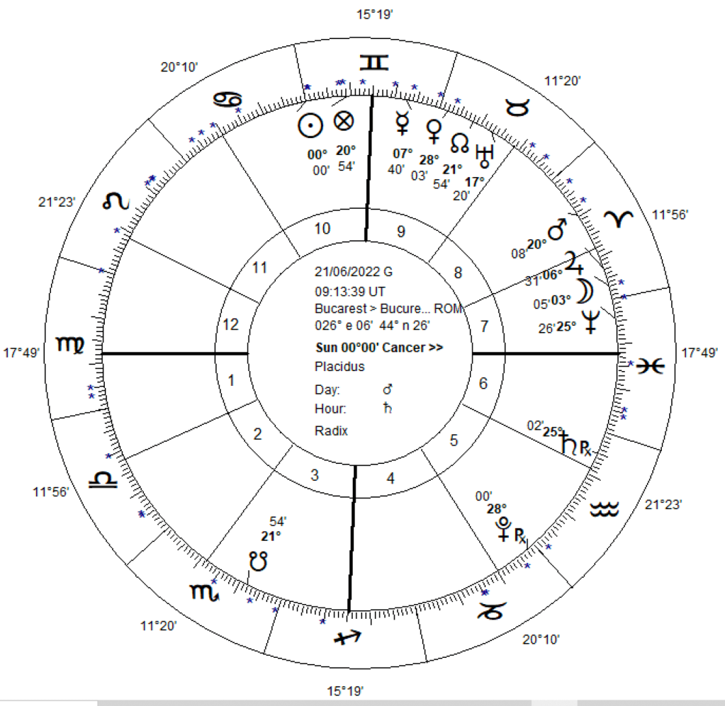 In calatoria sa aparenta pe ecliptica, Soarele soseste la 21 iunie la Tropicul Racului, atingand maximul sau de declinatie N, asociat cu solstitiul de vara sau inceputul verii astronomice. Am intrat in sezonul de vara in care timpul este cald cu predominanta anticiclonica de vreme calma si insorita. Toate planetele traditionale la 21 iunie sunt orientale la Soare si directe (exceptie face Saturn, fiind retrograd), prin urmare devin calde, avand puterea la randul lor de a calma si incalzi atmosfera. Sagetatorul la FC si Jupiter, o planeta de vreme calda si insorita aflat in Berbec, un alt semn de vreme calda, confirma o vara fierbinte. Jupiter, factor de expansiune va exagera tendinta generala a timpului, de unde ne putem astepta la recorduri de temperatura. Acelasi Jupiter in Berbec a dat temperatura maxima absoluta in vara anului 1951 in judetul Braila: + 44,5 grade. Jupiter primeste o cuadratura cu receptie mutuala de la Soare, care nu face decat sa exagereze natura calda a celor doua planete, iar cuadratura pe care Luna o primeste tot de la Soare, alunga tendintele depresionare de vreme ploioasa. Luna aplica la Jupiter: expansiunea caldurii si umiditatii in atmosfera.