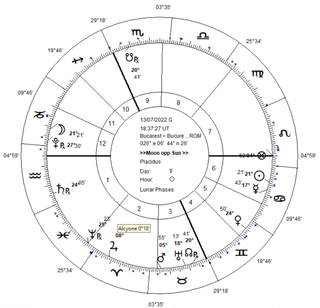 Urmatoarea Luna Plina la perigeu va avea loc la data de 13 iulie, cand ma astept la instabilitate atmosferica crescuta, intensificari ale vantului si caderi de precipitatii. O predominanta depresionara a planetelor accentueaza instabilitatea atmosferica, deoarece Luna Plina are loc pe axa zodiilor Rac – Capricorn si a caselor VI-XII, doua semne si case depresionare. O acumulare de factori astrologici inclina la turbulente in atmosfera: Mercur, semnificator al vanturilor primeste un sextil de la Uranus ce provoaca vanturi in rafale direct de sus care se disipa cand ating suprafata terestra, iar conjunctia acestuia cu Soarele are efect extrem prin perturbarea atmosferei, fiind un important factor de furtuna. Aspectul de cuadratura intre Venus la Neptun si trigonul acesteia cu Saturn sunt aspecte propice precipitatiilor. Toate acestea sunt accentuate de pozitia lui Mercur la Tropicul Racului, iar Marte si Uranus in casa III-a intensifica la randul lor vanturile si circulatia norilor prin numeroase schimbari de directiie.