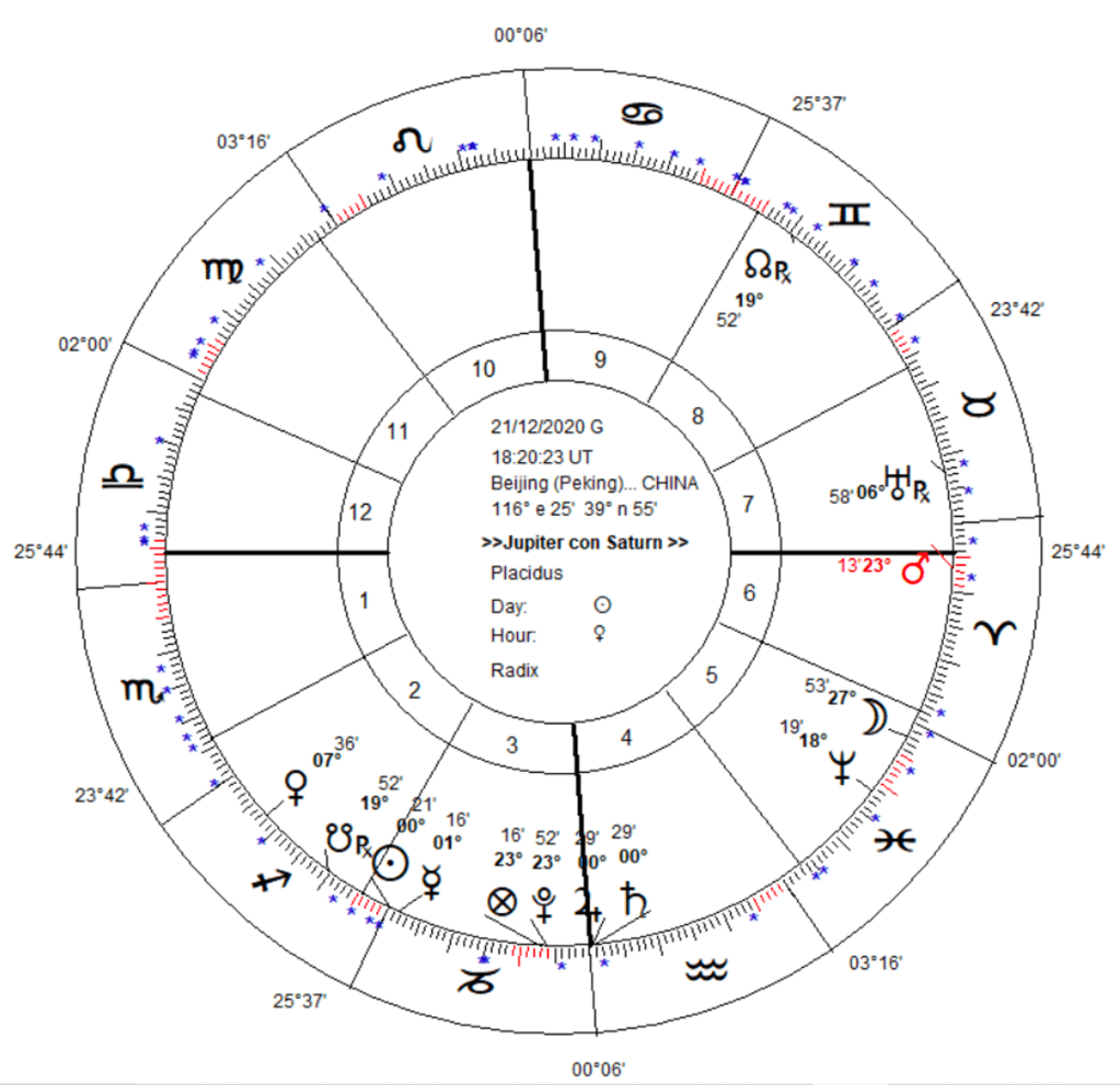 Este evident ca politica de stat a Chinei se axeaza pe reintregirea teritoriala a tarii, confirmata de Marea Conjunctie din 2020, in casa IV a teritoriului national. Saturn domina Conjunctia, fiind stapanul Punctului Primordial si al unghiului imediat anterior, de casa IV. De asemeni, este dispozitorul Soarelui, stapan de casa X, indiciu ca anumite chestiuni ce privesc teritoriul national sunt o preocupare majora pentru presedintele Xi. Insa Marea Conjunctie se afla pe steaua fixa Altair (Vulturul zburator), o stea de foc conflictuala si exploziva asociata cu tensiuni militare, semn ca problemele legate de teritoriul national vor implica forta militara. Este absolut evident pentru intreaga lume ca agresivitatea militara a Chinei este in crestere exponentiala semnificata de Marte, stapan de casa VI (armata, marina) in domiciliu si angular in casa VII, o casa de razboi printre alte semnificatii. ”China isi dezvolta capacitati militare uluitoare in domeniul armelor supersonice” declara in 2021 generalul american Mark Miley, Marina chineză fiind în prezent cea mai mare din lume.