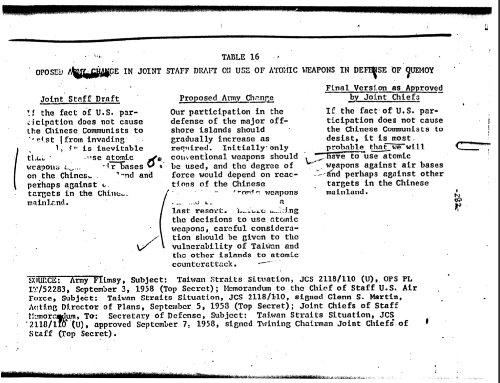 In actualul context tensionat dintre China si Taiwan trebuie mentionat ca acest conflict este unul mai vechi aparut in anii ’50. In 1945, la conferintele de la Potsdam si Yalta, s-a specificat ca Taiwan ar trebui sa revina sub suveranitatea Chinei odata eliberat de sub ocupatia japoneza de la 1895. Drept urmare, chinezii incearca sa anexeze Taiwanul de trei ori prin forta militara: in 1949, 1954 si 1958. Conflictul militar a inclinat in favoarea Chinei, ceea ce a alimentat temerile americanilor de expansiune a comunismului in Asia. La recomandarea sefilor de Stat Major americani de a folosi arma nucleara impotriva Chinei, Congresul american voteaza in ianuarie 1955 ”Rezolutia Formosa” care ii oferea dreptul presedintelui Eisenhower de a folosi acest tip de arma pentru a apara insula Taiwan. China face pasi inapoi si cere negocieri care iau sfarsit in mai 1955 prin semnarea unui acord de incetare a focului de ambele parti. Insa in august 1958 China ataca din nou insulele Matsu si Quemoy guvernate de Taiwan, moment in care americanii au fost la un pas de a lovi nuclear China pana aproape de Shanghai. După câteva săptămâni de bombardamente în care insulele erau în pericol grav, americanii reusesc să stabilească o linie de aprovizionare către Quemoy, debarcând printre altele, artilerie capabilă să livreze incarcaturi nucleare tactice. Conflictul s-a încheiat cu o încetare a focului, dar bombardamentele au continuat sporadic timp de mai bine de un deceniu.