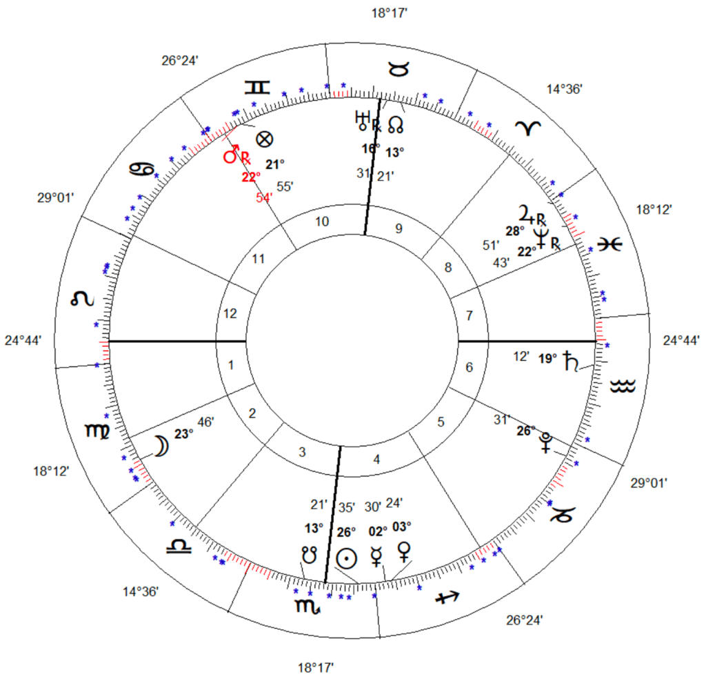 O va cauta? Soarele se separă prin aspect de Saturn, dar Luna face translație de lumină de la Marte, stăpân de casă III la Soare. Da, e posibil să-i trimită un mesaj, dar Marte ne arată și tipul de relație care există între ei: o relație instabilă, cu suișuri și coborâșuri, care ii creează ei tensiuni emoționale pentru că Marte este în cuadratura cu Luna. Are relația un viitor? Cu recepția negativă Saturn – Soare, cu Marte cuadratură Luna și cu recepțiile minore existente între semnificatorii lor este puțin probabil ca relația să aibă un viitor.