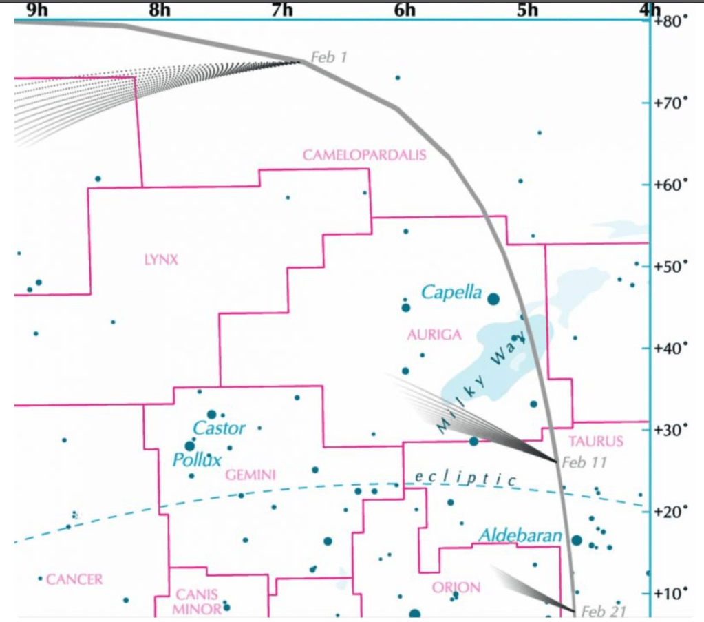 PS. Ieri, 5 februarie cometa a fost foarte aproape de steaua fixă Capella din constelația Auriga. Deși este considerată o stea norocoasă, în astrologia mundană lucrurile stau diferit datorită naturii sale Marte / Mercur asociate cu dezastrele naturale. Natura lui Marte este una violentă, iar Mercur este semnificator al vânturilor atât pe cât și sub Pământ, deci furtuni și cutremure. Astăzi, 6 februarie un cutremur de 7,8 grade a lovit sudul Turciei, cel mai puternic cutremur din ultima sută de ani.