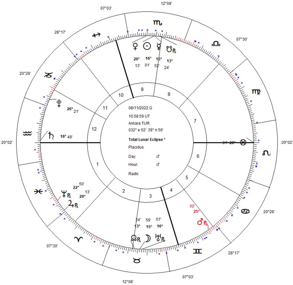 Dacă privim la ultima eclipsă de Lună pentru Ankara din 8 noiembrie 2022, observăm că aceasta a avut loc pe axa Taur – Scorpion, o axă seismică. O Lună exaltată in semn de pământ este eclipsată total. Soarele se află pe steaua fixă Lucida Lancis, o stea regală extrem de malefică și mortală împreună cu Mercur, stăpân de casă IV si semnificator al cutremurelor, iar Venus, stăpâna eclipsei este debilitata. Toată această tensiune astrală a eclipsei este descărcată de Saturn la Asc, semnificator al Turciei. Saturn este conjunct cu NS in antiscia, factor de pierderi si sacrificii pe care statul turc trebuie să le suporte. Notăm de asemeni pe Marte Rx în casa IV (o energie violentă prezentă în scoarța terestră) in cuadratura cu Neptun, aspect tipic seismelor.