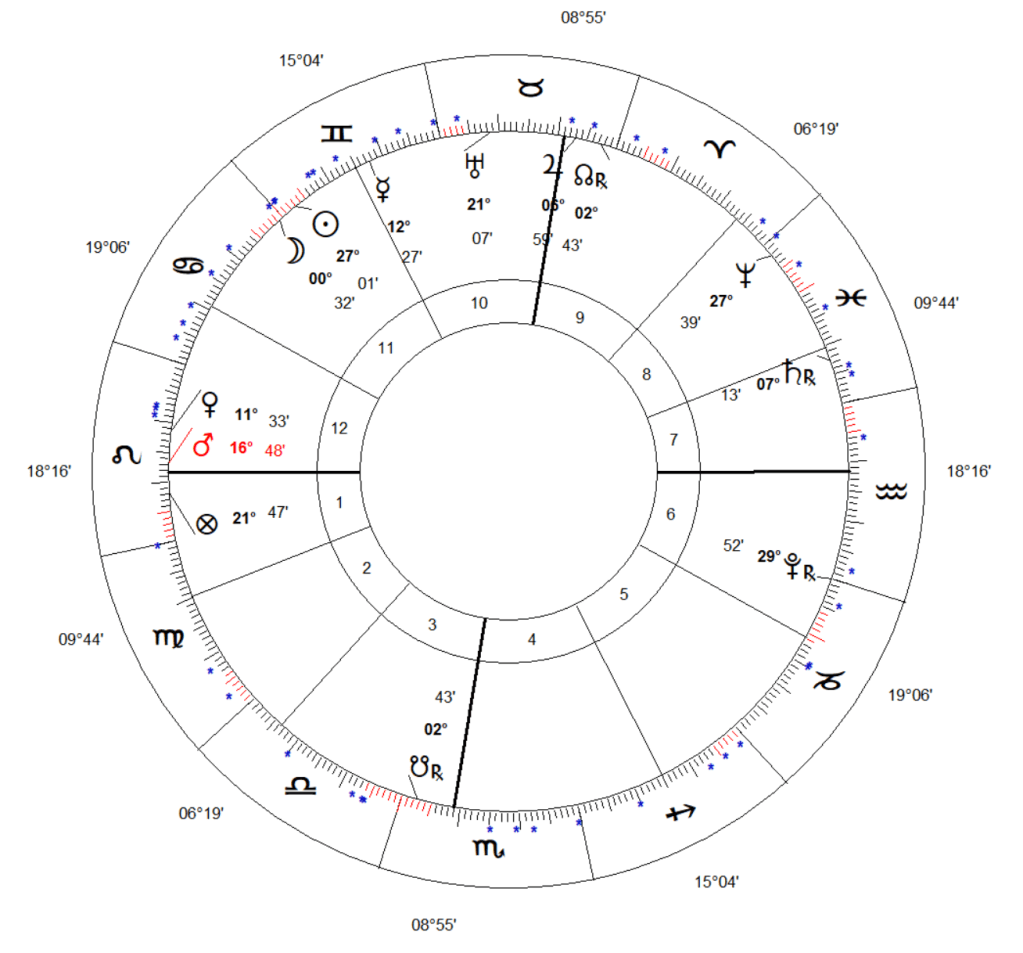 Primul lucru care atrage privirea este poziția lui Marte, semnificator natural al accidentelor și exploziilor la Ascendent, Marte fiind stăpân de casa IV a sfârșitului tuturor lucrurilor. Al doilea lucru este poziția lui Jupiter, stăpân de casă VIII a morții la MC pe steaua fixă Hamal, o stea nefastă de natura lui Marte / Saturn. Venus, stăpână de MC, ca succes al acestei operațiuni este peregrină în casa XII, o casă de suferință și conjunctă cu Uranus în antiscia: ceva rău și neprevăzut urma să se întâmple.