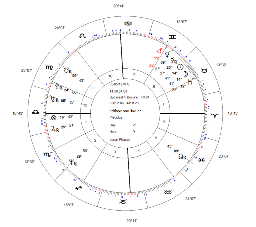 Luna Nouă din 5 mai 1970 prezintă ”deschiderea mică a porților” prin conjuncția Venus-Marte situată pe furtunoasa stea fixă Aldebaran. Luna trece de la Saturn la Soare și creează condițiile ”deschiderii mari a porților” pentru ploi abundente.