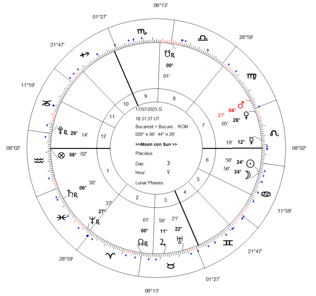 Recent, mai multe zone din nordul si vestul României au fost lovite de furtuni puternice, cu vânturi care au depășit 100 km pe oră. Luna Nouă din 17 iulie prezintă o ”deschidere mică a porților” prin cuadratura între Mercur si Jupiter. Mercur este semnificator al vânturilor in aspect cu Jupiter, care ii conferă forță aflat intr-o casă a vânturilor, casa III. Steaua fixa Alcyone la FC, o stea de vreme furtunoasă întărește instabilitatea atmosferică.