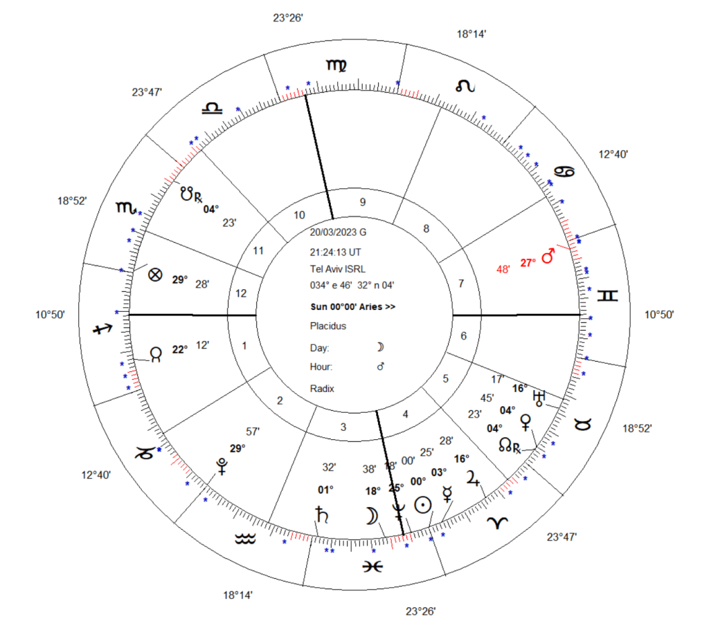 Ingressul Soarelui de primăvară pentru Tel Aviv activează trei stele fixe violente de natura lui Marte. Axa ASC-DSC este situată pe stelele fixe Antares și Aldebaran, stele foarte violente. Cum Ascendentul semnifică statul Israel, Antares, numită și steaua morții, arată că Israelul primește o lovitură de moarte, așa cum Scorpionul îl ucide pe arogantul Orion. Antares este în astrologia mundană o stea de război, factor de bătălii nemiloase, chiar mai acerbă în activitățile sale marțiale decât Marte însuși. Fiind o stea de toamnă, era evident că atacul va avea loc toamna. Când Egiptul a atacat Israelul în 1967, la ingressul de primăvară pentru Cairo, Aldebaran, o stea de primăvară era situată la ASC, atacul având loc primăvara.