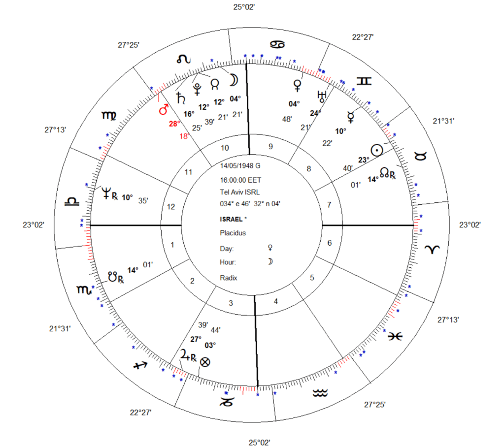 Marte, stăpân de casă VII, este conjunct cu steaua fixă Regulus, o stea regală ce conferă multă putere, faimă și onoruri militare. Configurația arată dușmani puternic înarmați, de notorietate (Hamas, Hezbollah), care sunt sprijiniți de țările vecine. (Marte primește un trigon de la Jupiter, stăpân de casă III – vecinii Israelului). La rândul său, Jupiter, aflat în opoziție prin antiscia cu Venus – statul Israel, arată că statele vecine își urmăresc propriile interese (demnitate esențială), și complotează pe ascuns împotriva Israelului (opoziție prin antiscia). Aldebaran, Ochiul Stâng al Taurului, ce privește spre Pământ, este conjunctă cu Mercur, stăpân de casă IX, a religiei. O combinație ce reflectă o religie ghidată de interese concrete, materialiste.