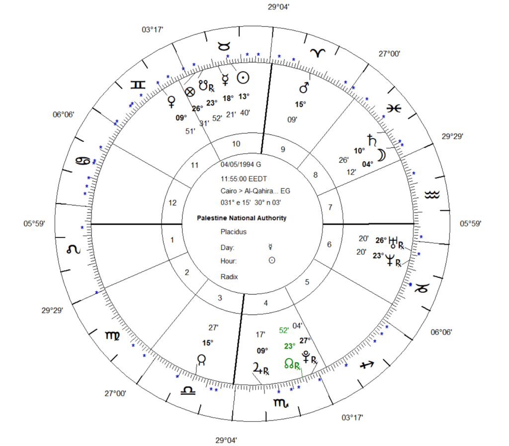 Venus, stăpâna de casa X, semnificatoare a liderilor acestei autorități, este conjunctă cu steaua regală Aldebaran, Ochiul Stâng al Taurului, ce privește spre Pământ. O conducere in care sunt implicate interese materiale? Poate nu întâmplător, administrația este privită ca iremediabil de coruptă, fiind acuzată că se bucură in lux ca niște pisici grase, de dolarii vărsați în sprijinul palestinienilor de țările arabe.