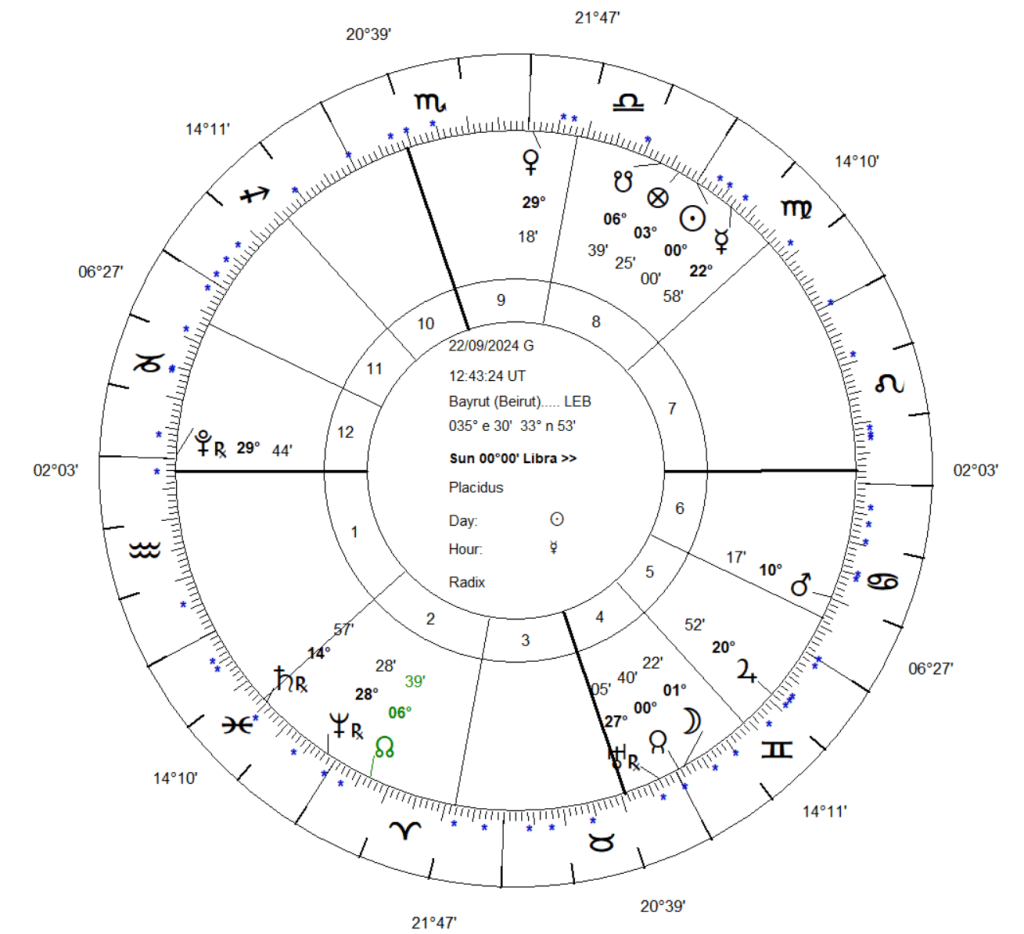 Harta echinocțiului de toamnă din 22 septembrie arată un Ascendent conjunct cu steaua fixă Altaïr, puternică stea alfa a Vulturului, o stea de război și tensiuni militare în astrologia mundană de natura lui Marte / Jupiter, ce conferă exces (Jupiter) de violență (Marte). Vulturul, care zboară în înălțimi pentru a vedea cum este lumea zeilor, arată că pericolul vine din cer: avioanele de atac ale Israelului asupra Libanului sau rachetele lansate de Hezbollah în nordul Israelului sunt o amenințare pentru populația celor două țări. În primăvara anului 2001, aceeași stea fixă Altaïr culmina la Mijlocul Cerului în harta de ingress pentru Washington: avioanele teroriștilor islamiști intrau în Turnurile Gemene și America intra în război cu Afghanistan. După același model, nu este exclus să vedem o invazie terestră a trupelor israeliene în Liban.