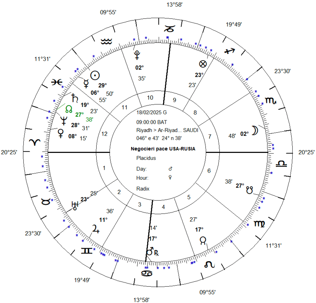 Negocierile și discuțiile sunt guvernate de Mercur, aflat în Pești în detriment, cădere și sub razele Soarelui, deci extrem de slăbit. Luna aplică imediat prin aspect la Mercur, ceea ce arată importanța acestor discuții, dar antiscia lui Mercur se află la Descendent, o casă de conflicte și război în astrologia mundană, discuțiile au vizat actualul conflict fără să se fi ajuns la concluzii și decizii importante.