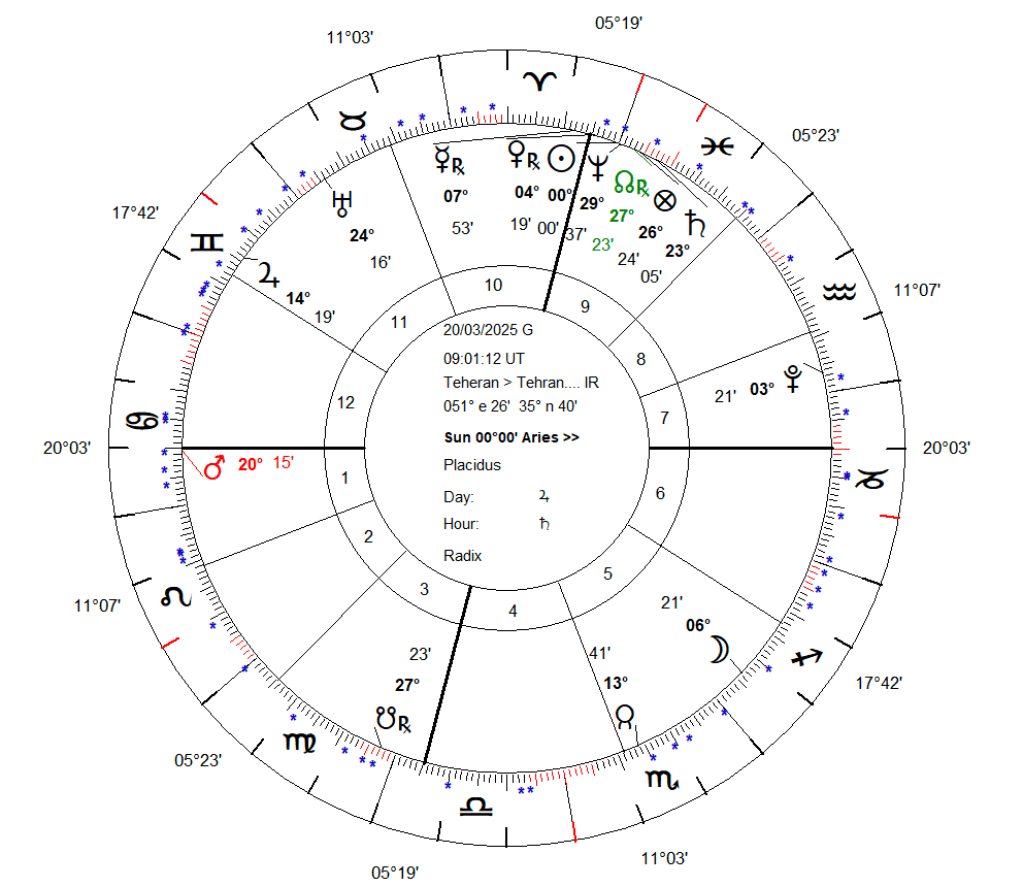 Harta de ingress ridicată pentru intrarea Soarelui în Berbec, ne arată climatul general al anului 2025 pentru o țară, aceasta fiind valabilă până la următorul ingress din 2026. Harta calculată pentru capitală țării, Teheran, arată un Ascendent în Rac, semnificator al țării, ca de altfel și Luna, stăpâna acestuia. Ce atrage puternic atenția în acest ingress este poziția lui Marte, semnificator natural al războiului la Ascendent, conjunct cu steaua fixă Castor din Constelația Gemenilor. Castor este în mitologie frate geamăn cu Pollux, cel nemuritor, iar Castor este cel care a fost ucis în lupta. Antiscia lui Marte cade la 10 grade Gemeni, pe steaua fixă Aldebaran. Ambele stele fiind violente, de natura lui Marte, nu fac decât să-l potențeze pe acest Marte debilitat, factor de agresiune asupra Iranului. Luna, stăpână Ascendentului se află în antiscia în opoziție cu Marte, deci avem o dublă confirmare că există posibilitatea că Iranul să fie atacat.