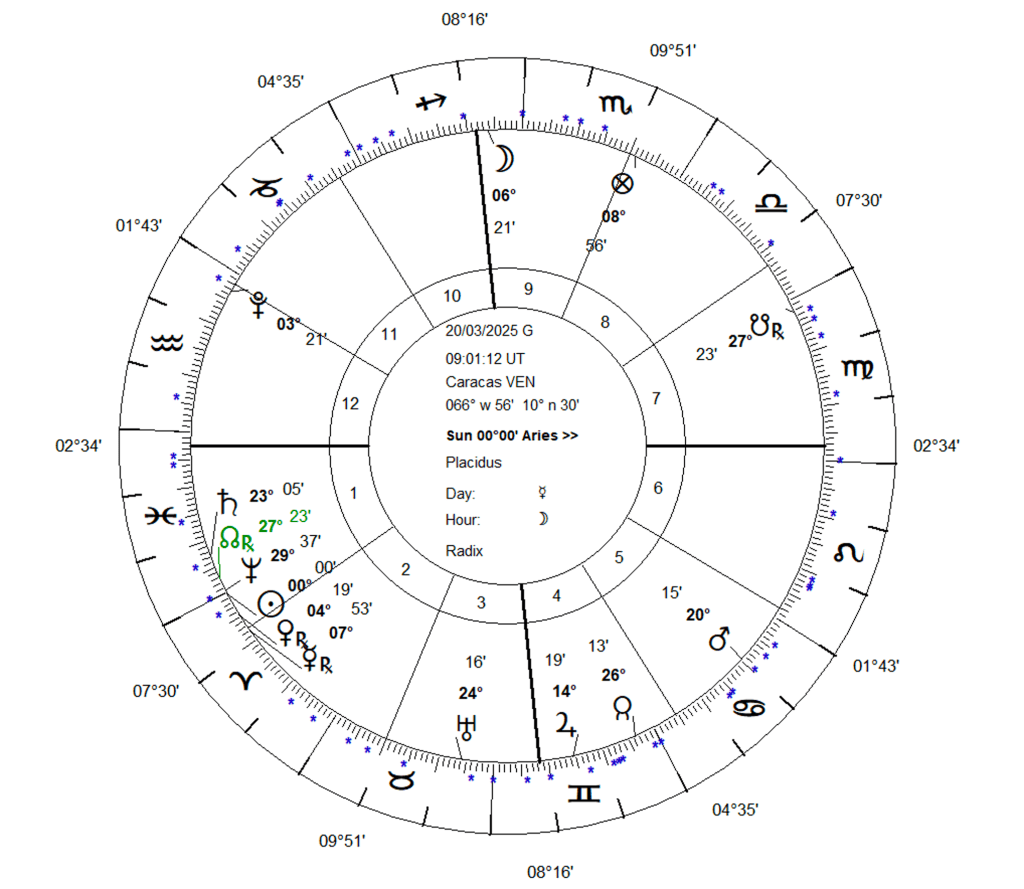 Intrarea Soarelui în Berbec la Caracas a avut loc la ora 9.01 GMT în data de 20 martie. Marte, dispozitorul Soarelui debilitat în Rac, se află pe steaua fixă Castor, fratele geamăn al lui Polux din Constelația Gemenillor. O malefică debilitată în antiscia la Fundul Cerului afectează Guvernul prin opoziție la Mijlocul Cerului, iar această este foarte rău pentru Maduro. Un alt element este poziția Lunii, stăpână de casă VIII de la casa X, conjunctă cu Mijlocul Cerului, sub steaua fixă Antares, o stea de sfârșit de ciclu, aceasta fiind o combinație letală. Nu în ultimul rând, Jupiter, stăpân de casă X se află în partea cea mai de jos a hărții, deci în detriment, o poziție extrem de debilitată, care nu-l avantajează deloc pe Maduro. În casa I avem două planete (Saturn și Soarele), care guvernează două case nefericite: XII, respectiv VI, ceea ce nu este deloc de bun augur pentru Venezuela. Toate acestea oferă o imagine sumbră pentru viitorul lui Nicolas Maduro.