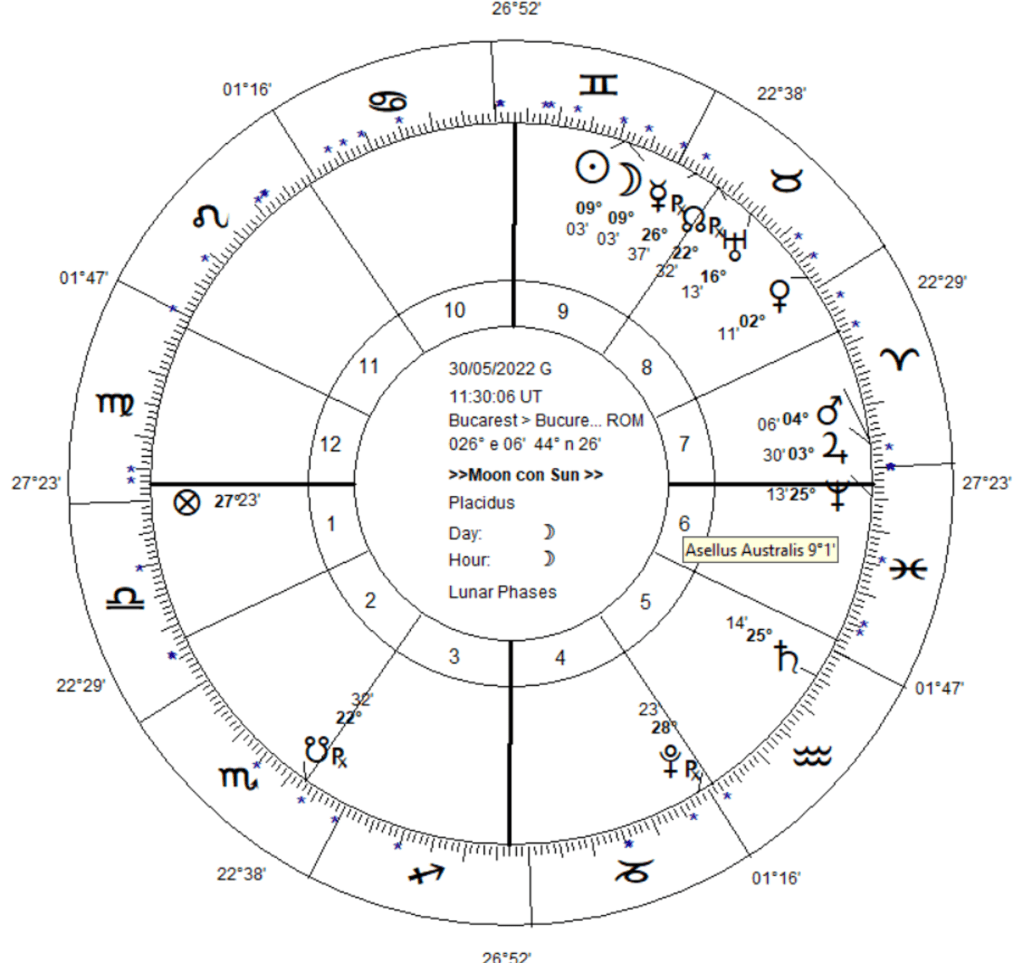 Pentru perioada 30 mai – 7 iunie, Luna Noua din 30 mai anunta o schimbare de regiim termic pentru ca lunatia are loc in Gemeni, semn masculin, pozitiv, de vreme insorita. Lunatia aspecteaza conjunctia Marte – Jupiter, doua planete anticiclonice de vreme calda si insorita, angulare in casa VII, conferindu-le forta de manifestare. Cum Jupiter este stapan de casa IV ”baza timpului,” acesta va expansiona natura fierbinte si uscata a lui Marte, generand o crestere considerabila a temperaturilor cu efect de canicula. Saturn, desi este o planeta rece, depresionara, prin pozitia sa intr-un semn masculin de vreme insorita si o casa de caldura V, confirma o crestere considerabila a temperaturilor in aceasta saptamana.