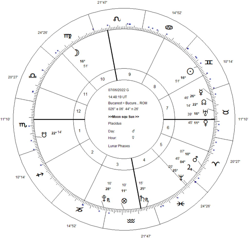 In calatoria sa aparenta pe ecliptica, Soarele soseste la 21 iunie la Tropicul Racului, atingand maximul sau de declinatie N, asociat cu solstitiul de vara sau inceputul verii astronomice. Am intrat in sezonul de vara in care timpul este cald cu predominanta anticiclonica de vreme calma si insorita. Toate planetele traditionale la 21 iunie sunt orientale la Soare si directe (exceptie face Saturn, fiind retrograd), prin urmare devin calde, avand puterea la randul lor de a calma si incalzi atmosfera. Sagetatorul la FC si Jupiter, o planeta de vreme calda si insorita aflat in Berbec, un alt semn de vreme calda, confirma o vara fierbinte. Jupiter, factor de expansiune va exagera tendinta generala a timpului, de unde ne putem astepta la recorduri de temperatura.Acelasi Jupiter in Berbec a dat temperatura maxima absoluta in vara anului 1951 in judetul Braila: + 44,5 grade. Jupiter primeste o cuadratura cu receptie mutuala de la Soare, care nu face decat sa exagereze natura calda a celor doua planete, iar cuadratura pe care Luna o primeste tot de la Soare, alunga tendintele depresionare de vreme ploioasa. Luna aplica la Jupiter: expansiunea caldurii si umiditatii in atmosfera.